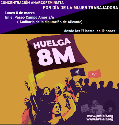 🟣⚫Este lunes 8 de marzo CNT-AIT Alicante, convoca a la concentración Anarcofeminista por el «DIA DE LA MUJER TRABAJADORA»