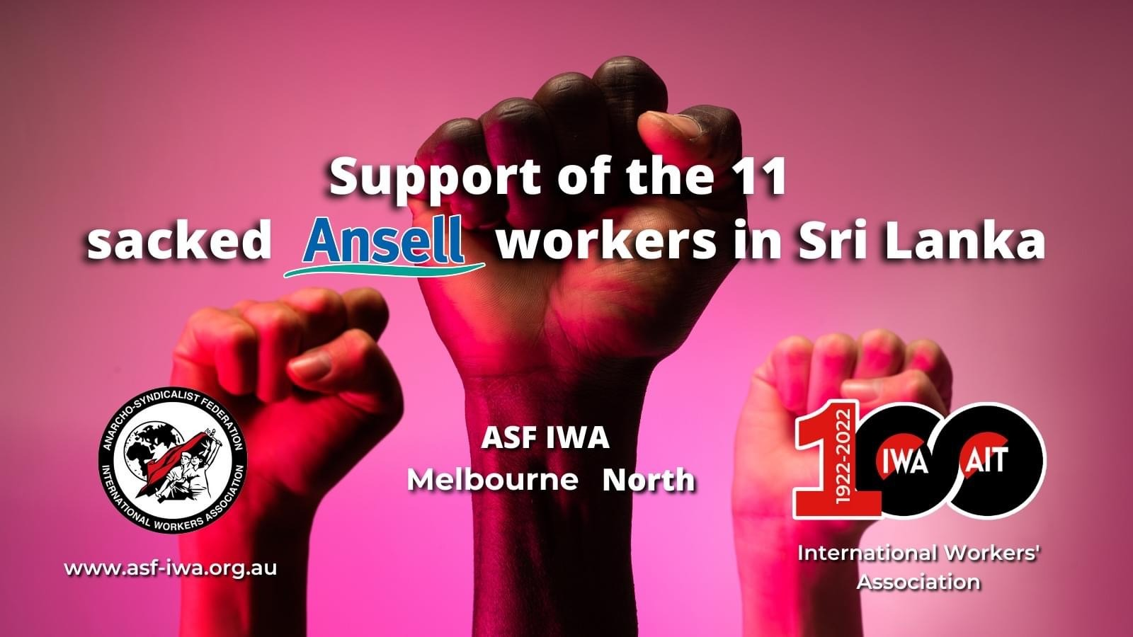 ASF Melbourne North organised a campaign of pickets at the global HQ of Ansell in Melbourne. IWA affiliates around the world sent protest emails to Ansell many times. ASF Melbourne North co-operated with Australia Asia Worker Links in protest actions against Ansell. The ASF Melbourne North received support from Workers Solidarity Alliance, US affiliate of the IWA and CNT-AIT France with research and reconnaissance in prepartaion for an international expansion of the solidarity campaign.