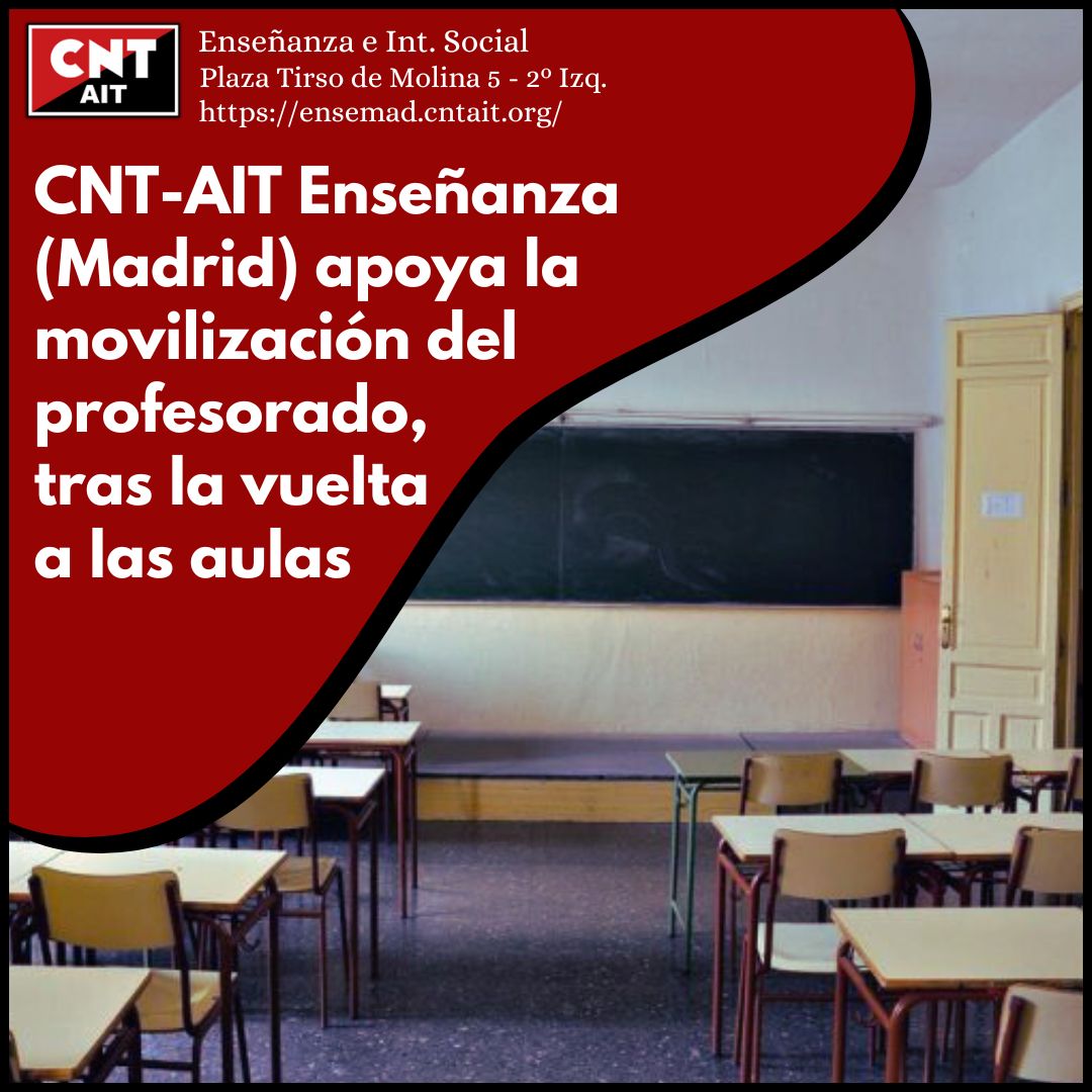 La entrada CNT-AIT Enseñanza (Madrid) apoya la movilización del profesorado, tras la vuelta a las aulas se publicó primero en Sindicato de Enseñanza e Intervención Social de CNT-AIT Madrid.