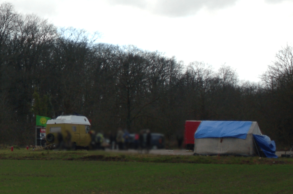 Derweil fand am Waldrand nahe des fast komplett abgerissenen Dorfes Kerpen-Manheim (alt) die seit Monaten im Wochenrhythmus organisierte Mahnwache vorerst einen festen Standort. Neben einem Zelt und LKWs trafen sich seit dem frühen Morgen dutzende Klima-Aktivist*innen zur Unterstützung der Waldbesetzer*innen. Erst gab es Frühstücksbrötchen, Heißgetränke und Kuchen, später auch Karottensuppe mit Salat – dazu jede Menge Livemusik und stimmungsvoller Gesang.