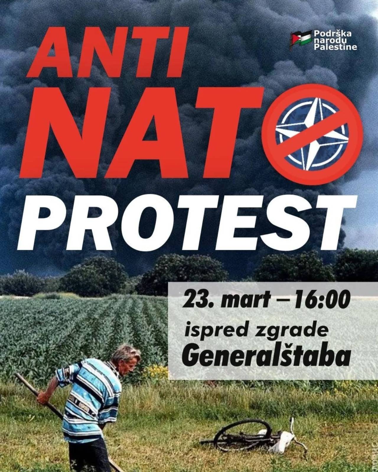 Pozivamo vas na protest u nedelju, 23. marta u 16:00 ispred Generalštaba, koji Podrška narodu Palestine organizuje na 26. godišnjicu od početka NATO agresije na radničku klasu tadašnje SRJ