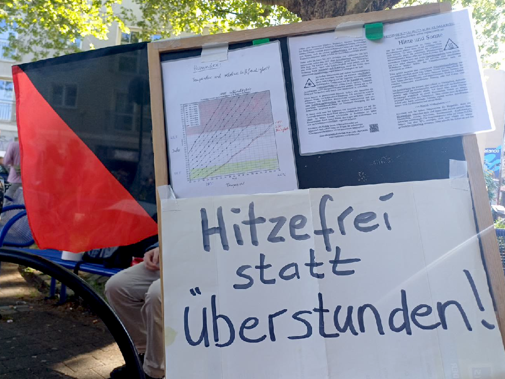 Anlässlich des Internationalen Gedenktags für die Opfer von Arbeitsunfällen und Berufskrankheiten (28.04.) haben wir eine kleine Aktion in Köln-Ehrenfeld organisiert. Dabei konnten wir mit interessierten Arbeiter*innen ins Gespräch kommen und dabei auf die zunehmenden Gesundheitsgefahren durch die Erderhitzung in der Klimakrise aufmerksam machen.
