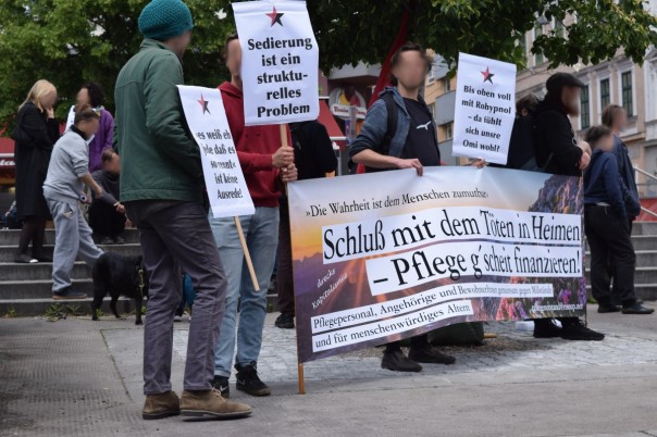 Es geht nicht darum, dass irgendwer verurteilt oder bestraft wird für den Tod von Frau W. Es geht darum, die Bedingungen in Pflegeheimen so zu verbessern, dass so etwas nicht mehr passieren kann! In diesem Kampf haben PflegearbeiterInnen und HeimbewohnerInnen letztlich dieselben Interessen: nur wenn die Bedingungen für die Pflegenden gut sind, kann es auch gute Pflege für die BewohnerInnen geben, ohne massenhafte Medikalisierung mit Psychopharmaka und die draus resultierenden Tode wie den von Frau W. In dem Sinne rufen wir zur gemeinsamen Organisierung von Pflegenden und BewohnerInnen auf, da nur dies Selbstorganisierung der Betroffenen diese Zustände beseitigen kann. Und für dies PassantInnen: wenn Sie mehr Informationen zum Tod von Frau W. haben wollen, dann kommen sie zu uns und nehmen Sie unsere Flugzettel.