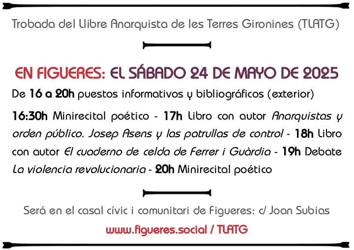En la calle Joan Subias tendremos mesas de 3 colectivos para hacer difusión de los principios, tácticas y finalidades del anarquismo, con libros y colectas, material de propaganda de afinidad libertaria.