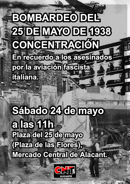 Recordamos a quienes murieron en Alicante hace 87 años y en tantas otras ciudades españolas que fueron masacradas por la aviación de los ejércitos invasores fascistas y nazis que apoyaron al bando franquista, con el objetivo de asfixiar las aspiraciones de justicia y libertad del pueblo. Pero también recordamos al pueblo palestino y el genocidio que sufre a manos del Estado de Israel, así como a las víctimas de Yemen, Ucrania, Sudán… Situaciones en las que, una vez más, la población civil sufre las consecuencias de guerras ajenas: éxodos, hambre y muerte.