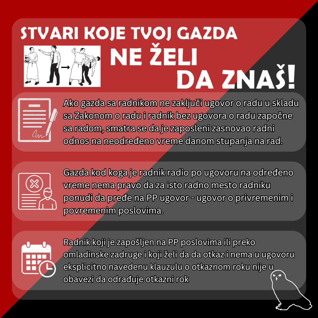 Zakonski okviri nisu nešto na šta se mnogo oslanjamo i sami zahtevi naše borbe ih često prevazilaze, ali nam pružaju kakav-takav oslonac i priliku za lake pobede oko kojih možemo započeti organizovanje na svom radnom mestu.