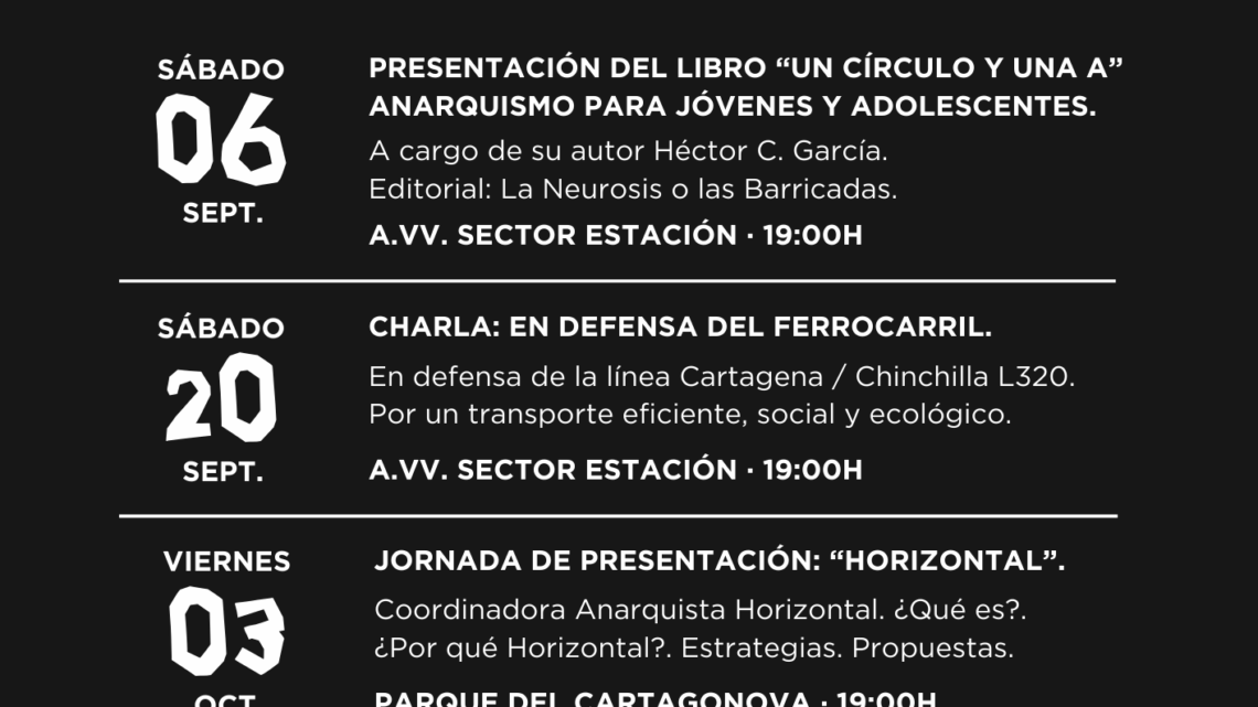 Te invitamos a las actividades culturales organizadas por la CNT-AIT de Cartagena y el Ateneo Libertario de la ciudad, en colaboración con la editorial «La Neurosis o Las Barricadas», la Coordinadora «Horizontal», la A.VV. del «Sector Estación» de Cartagena, la «UNED» y Carlos Taibo, profesor jubilado de Ciencia Política y de la Administración en la