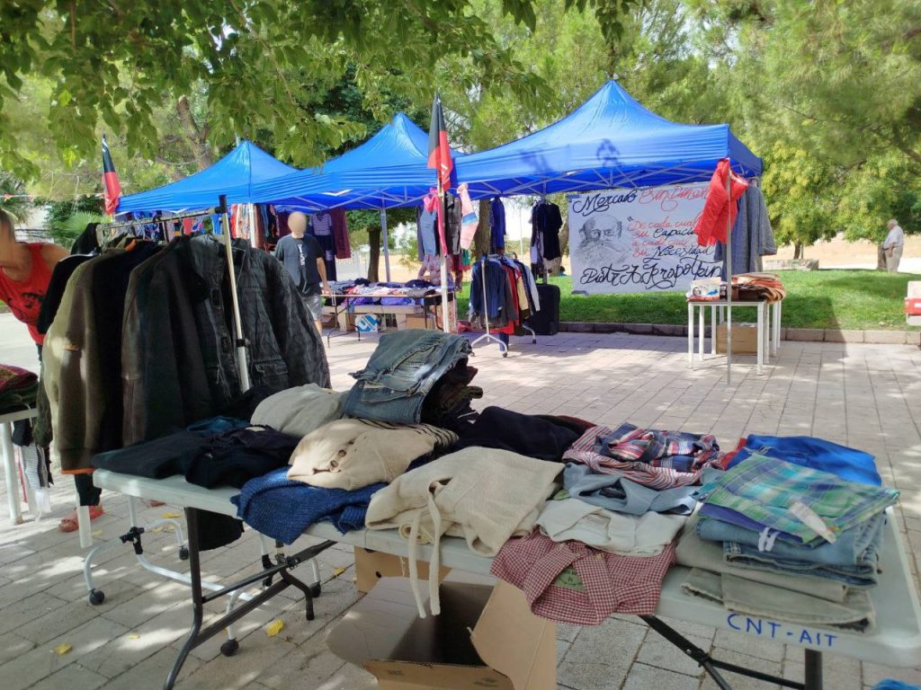 Como es habitual, la ropa de mujer era lo mayoritario debido al asedio que la dictadura de la moda y la belleza imponen principalmente sobre las mujeres, con una maquinaria de publicidad y marketing omnipresente que multiplica las ventas de las grandes cadenas, explotando a las trabajadoras y el medioambiente de muchos países pobres. La inmensa desigualdad entre territorios y clases que el capitalismo genera, también se puede apreciar en la Colectividad, decenas de trabajadores migrantes del campo pasan por el parque de la Unión habitualmente ya que cerca tienen sus “campamentos”, se ven obligados a construir chabolas en descampados ya que no les alquilan viviendas en la ciudad, en parte por no tener acceso a regularización, y en parte por puro racismo… Estos trabajadores, mayoritariamente de Senegal o Malí, van conociendo la Colectividad y como es habitual la ropa de hombre, mantas o enseres de concina (más minoritarios) suelen agotarse pronto a su paso.
