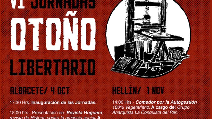 Las actividades comenzaran el próximo día 4 de octubre a las 17:30 hrs. en Albacete, en el local de la CNT-AIT, se inaugurarán las Jornadas de Otoño Libertario y se dará comienzo a las 18:00 hrs. con la presentación de dos proyectos editoriales. El primero de ellos: la Revista Hoguera 2# (Murcia) y después el libro El ABC del Comunismo Libertario; a cargo de la Editorial Anarcosindicalista Aurora Negra.