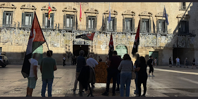 CNT-AIT Alicante despliega un contundente piquete de 4 Horas en el Ayuntamiento contra Eurest Colectividades S.L, la complicidad y pasividad política y de todas las instituciones.El pasado 30 de octubre , la Plaza del Ayuntamiento de Alicante fue testigo de una jornada de protesta de cuatro horas (de 9:00 a 13:00 de la mañana) organizada por la CNT-AIT de Alicante y su Sección Sindical en Eurest Colectividades. La acción se enmarca en la decidida campaña de denuncia contra la precarización sistemática, la falta de higiene intolerable en la contaminación cruzada y la represión sindical ejercida por la empresa que gestiona estos servicios esenciales: Menjar a Casa y Mayor a Casa. La protesta contó con una nutrida presencia de la militancia de CNT-AIT Alicante y, de manera especialmente significativa, con la asistencia de las trabajadoras del Centro de Día cerrado. Se denunció con megáfono en mano y sin tapujos la dimisión de todo el ayuntamiento y todos los políticos del mundo. El piquete se caracterizó por su tono firme y contundente, señalando directamente a los responsables políticos de la situación y a todas las instituciones. Expresando el hartazgo de la inacción e inutilidad de todos estos personajes que viven del cuento. Y les dijimos a la cara lo fascistas que son. La rabia y la indignación resonaron en la plaza, poniendo en evidencia que la precariedad de los servicios a personas dependientes es el resultado de la complicidad y el desinterés político. También se denunció públicamente a los políticos ‘progres’ que se acercaron a la protesta, a quienes se les acusó de apropiarse de las luchas y acciones que son exclusivas de las trabajadoras, a pesar de que conocen estas irregularidades desde el principio y no hacen absolutamente nada. La trayectoria de esta lucha es larga y dolorosa. Las trabajadoras han acudido a todas las instancias posibles a lo largo de los años para denunciar los hechos: Inspección de Trabajo, Inspección Sanitaria, Síndic de Greuges, Ayuntamiento de Alicante, Diputación de Alicante y Consellería. A parte de un sin fin de conflictos laborales, los cuales han ganado siempre en sus tribunales “burgueses” de su mal llamada “justicia”.