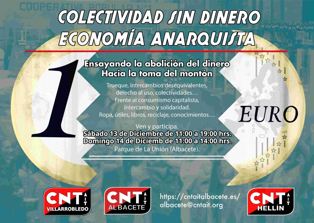 Con el fin de seguir rompiendo cultural y económicamente tanto con la superstición de que el dinero es necesario en las sociedades avanzadas, como con la creencia de que los intercambios deben ser equivalentes e individuales, desde la CNT-AIT Albacete volvemos a desarrollar este pequeño ensayo económico que es las Jornadas de Economía Anarquista Colectividad Sin Dinero, un foro de economía anarquista práctica, esta vez centrándonos mucho más en la idea de “la Toma del Montón” ya que en el primer mercado la tendencia natural de las y los participantes condujo gratamente a esta fórmula colectiva fundamental.