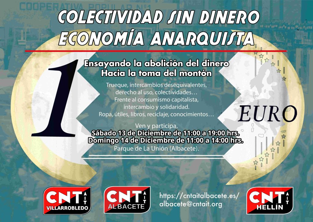 Con el fin de seguir rompiendo cultural y económicamente tanto con la superstición de que el dinero es necesario en las sociedades avanzadas, como con la creencia de que los intercambios deben ser equivalentes e individuales, desde la CNT-AIT Albacete volvemos a desarrollar este pequeño ensayo económico que es las Jornadas de Economía Anarquista Colectividad Sin Dinero, un foro de economía anarquista práctica, esta vez centrándonos mucho más en la idea de “la Toma del Montón” ya que en el primer mercado la tendencia natural de las y los participantes condujo gratamente a esta fórmula colectiva fundamental.