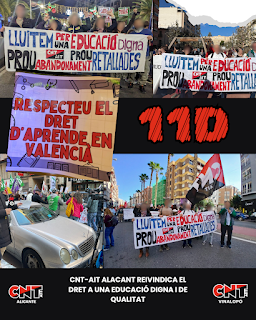 La jornada va aplegar milers de persones que s’oposen a l’actual model de retallades que ha portat a terme l’actual govern del PP. Els carrers es van omplir de docents, famílies i estudiants sota un mateix lema urgent: parar les retallades i defensar un sistema educatiu públic, de qualitat, amb el valencià com a llengua vehicular. Des de la CNT-AIT ALACANT ens vam unir a aquestes demandes no sols com a treballadors de l’ensenyament afectats per la precarietat, estudiants i militants, sinó com a individus crítics que exigeixen una transformació profunda de la realitat educativa.