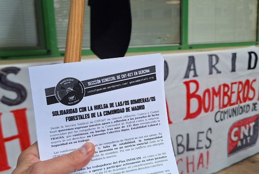 Desde la Sección Sindical de CNT-AIT en Geacam y el Sindicato de Oficios Varios de Albacete de la CNT-AIT queremos informar de nuestra adhesión a la convocatoria del día 10 de diciembre, así como nuestra solidaridad con los Bomberos y Bomberas Forestales de la Comunidad de Madrid, ya más de 140 días en huelga.