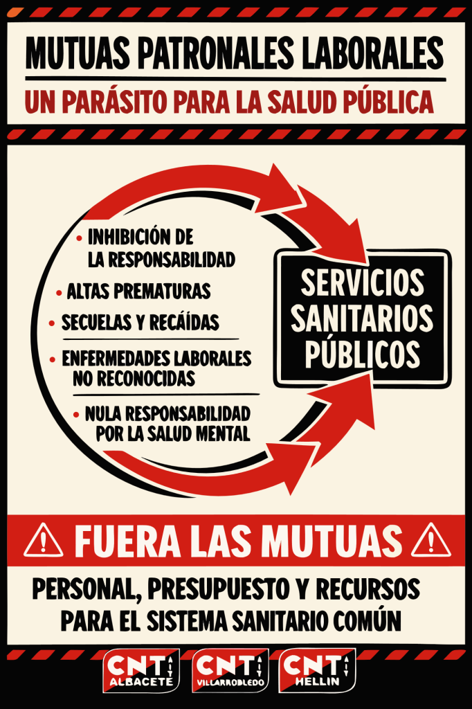 A las patronales “se les llena la boca” de modernización en todos los aspectos productivos, y sin embargo tenemos una “antigualla” de sistema de salud laboral, privatizado, e incapaz de afrontar la realidad laboral actual que afecta físicamente, pero sobre todo mentalmente, donde el consumo de antidepresivos para soportar la presión es ya algo irregularmente cotidiano. Un sistema de salud laboral que obstaculiza el reconocimiento de enfermedades laborales, como se puede ver comparándonos con Francia donde la salud laboral esta gestionada por la Seguridad Social, y se reconoce a 322 trabajadores con enfermedad laboral por cada 100.000, cuando aquí la cifra ronda los 92… Un sistema que, endosa a los servicios de salud públicos casi por sistema, innumerables incidencias que son de base laboral, saturando este servicio común… Un sistema, que aunque se diga que paga la patronal, en última instancia ese pago sale del tiempo y el esfuerzo de las y los trabajadores, como toda riqueza empresarial… Un sistema que ha permitido reforzar económicamente los negocios de salud privados, hasta llegar al punto actual donde directamente compiten con el sistema público, cada vez más desmantelado políticamente…