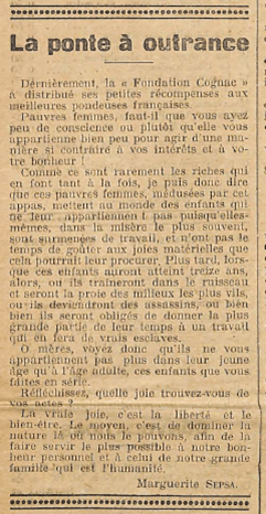 Comme ce sont rarement les riches qui en font tant à la fois, je puis donc dire que ces pauvres femmes, médusées par cet appas, mettent au monde des enfants qui ne leur appartiennent pas puisqu’elles-mêmes, dans la misère le plus souvent, sont surmenées de travail, et n’ont pas le temps de goûter aux joies matérielles que cela pourrait leur procurer. Plus tard, lorsque ces enfants auront atteint treize ans, alors, ou ils traineront dans le ruisseau et seront la proie des milieux les plus vils, ou ils deviendront des assassins [militaires], ou bien ils seront obligés de donneur la plus grande partie de leur temps à un travail qui en fera de vrais esclaves.