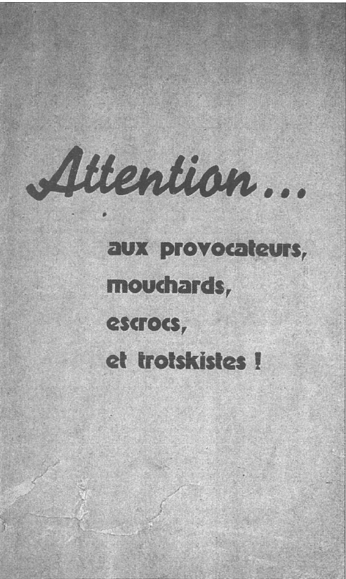 Afin de détruire le Front Populaire et de diviser la classe ouvrière et ses organisatoins, la bourgeoisie emploie, avant tout, les criminels de droit commun, les agents sans scrupule du fascisme international que sont les trotskystes. Pour réaliser leur ignoble besogne dans l’intérêt de leurs maîtres de Rome et de Berlin, ceux-ci cherchent à pénétrer partout, en masquant par tous les moyens leur véritable figure.